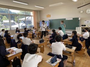 外国語の授業では、英語をたくさんしゃべっています。教頭先生の投げかけに対しての素直な反応に、可愛くてついつい笑ってしまいます。