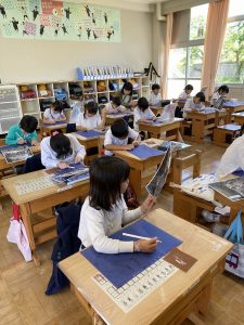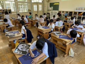 すごい集中力で、作品に取りかかっています。「こんなん絶対無理~!描けない~!!」って言っていたのがウソのように。気分はまるで画家です。午後の授業でこの集中力は、ものすごいです。おうちのみなさん、完成を、今からたのしみにしておいてくださいね! 大作です!!