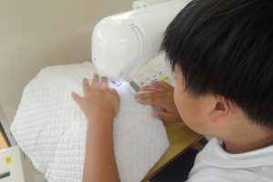 家庭科では、ナップザックを製作中。動画を見たり、先生や友だちに聞いたりして、着々と作業を進めています。