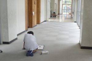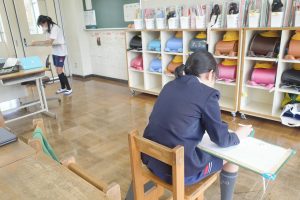 図工では、6年間過ごした城東小学校の中で自分のお気に入りの場所を選び、絵を描いています。ものの見え方、遠近にもこだわって進めています。今は、下書きをしていますが、どんな作品になるのか楽しみです。