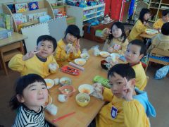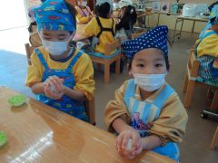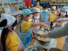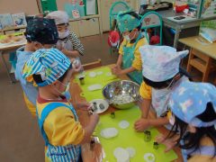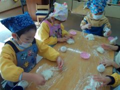 16日(火)は収穫したサツマイモを使ったクッキングをしました。クッキングのメニューは『豚汁』『おにぎり』『ゆで卵』です。まずはみんなで豚汁に入れる野菜を型抜きでくりぬいたり、手でちぎったりしました。「きれいに型抜きできた!」「サツマイモは固いね!」と友だちと気づいたことを話したり、「こっちを上向きにして型抜きをするんだよ」とすみれ組がさくら組に優しく教えたりする姿もありました。そして、みんなで豚汁を作っている間にご飯が炊きあがり、できたてのご飯でみんなでおにぎり作りをしました。自分の好きな味のふりかけを選び、それぞれに自分好みのおにぎりができ、大喜びでした!そして、デザートにはクリスマスにちなんだかわいいケーキを作り、みんなでいただきました。自分たちで作った料理の味は特別✨だったようで、みんな笑顔で食べていました。楽しいクッキングの時間になりました。