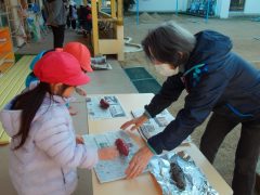 19日(金)に民生委員児童委員さんと一緒に収穫祭(焼き芋大会)を実施しました。みんなでサツマイモの苗植えをし、たくさんサツマイモを収穫した日から焼き芋大会の日を心待ちにしていました。民生委員児童委員さんに教えてもらいながら、綺麗に洗ったサツマイモを新聞紙、アルミホイルの順で包んで焼き芋の準備をしました。昨年度経験したことを思い出したり、民生委員児童委員さんに優しく教えてもらったりしながら手際よく取り組んでいました。