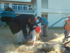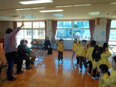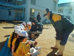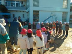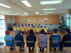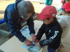 新聞紙、アルミホイルで包んだサツマイモを火の中に入れ、「おいしくなあれ!」とみんなで声をかけました。そして、焼き芋が出来上がるまで、民生委員児童委員さんにクリスマス会の歌や合奏を見ていただいたり、一緒にやきいもグーチーパーをしたりしながら、楽しい時間を過ごしました。