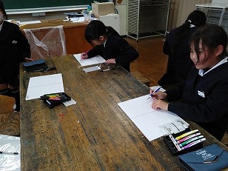 前回までの授業で「海の生き物」をテーマに、下絵を描き、今回は初めての彫刻刀にチャレンジしました。
