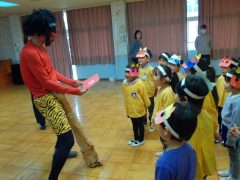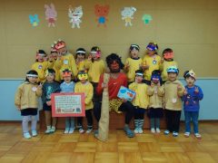 そして3日の節分の日には、さくら組・すみれ組みんなで一緒に豆まきをしました。「鬼は外!福は内!」と言いながら、自分の心の中にいる鬼を退治しました。そして、みんなで豆まきをしていると…赤鬼が登場!初めて鬼を見たさくら組はちょっぴりドキドキ、少し怖いな~と感じている子もいましたが、すみれ組さんに「かやのみ幼稚園の鬼は怖くないよ!」と教えてもらい、安心した様子でした。そしてかやのみ幼稚園に遊びに来た赤鬼は怖い鬼ではなく、『優しいあかおにいさん』でした!それから、あかおにいさんにすみれ組からプレゼントを渡したり、英語の歌やダンスを見てもらったりして、鬼と仲良くなることができました。「おにいさんにまた会いたい!」と、来年の節分でも会えることを楽しみにしているみんなでした☆