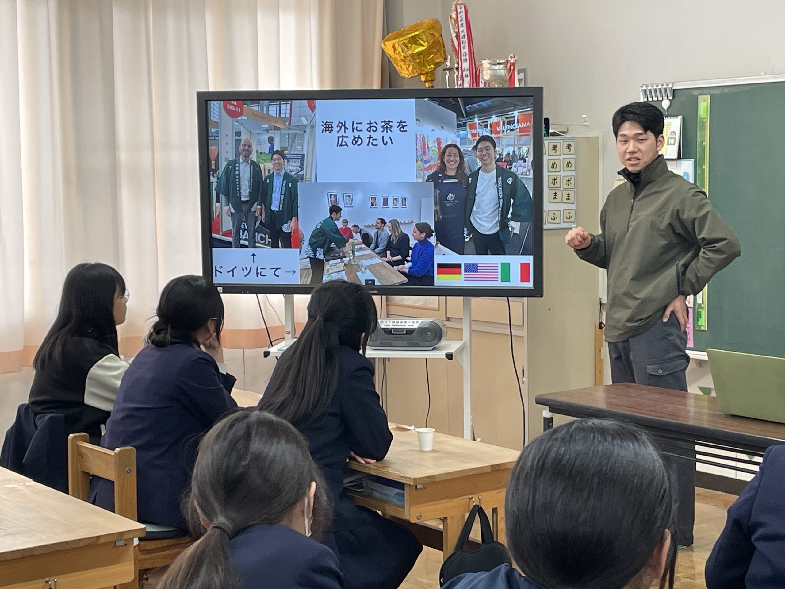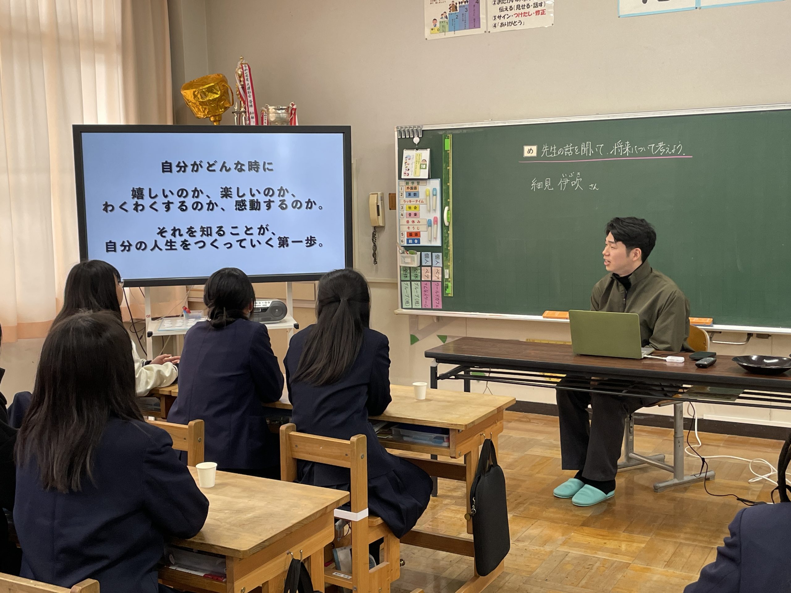 自分の将来について考える時間。丹波市でお茶屋をしている徳寿園の細見さんに来ていただきました。自身が仕事を始めだしたきっかけや卒業間近の6年生に伝えておきたいことなど、熱く楽しく語っていただきました。