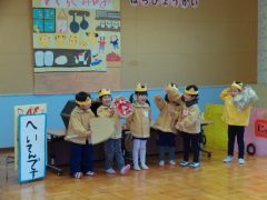 13日(金)に生活発表会を行いました。この日に向けてそれぞれのクラスでどんな姿をお家の人に見てもらいたいかを話し合ったり、自分たちでセリフや役を考え合ったりしながら、さくら組・すみれ組それぞれクラスで力を合わせながら、お話遊びを楽しんできました。さくら組は『ノラネコぐんだん ピザをやく』、すみれ組は『100かいだてのいえ~すみれ組バージョン~』のお話あそびを見てもらいました。