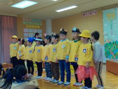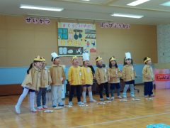 さくら組のお話遊びでは、大好きなネコになりきって表現をしたり、普段の生活の中で遊んでいるお店屋さんごっこでのやり取りや、一人一人が頑張って覚えたセリフも発表しました。また、なわとびやダンス等それぞれに得意なことやできるようになってことをお話遊びの中で披露しました。さくら組にとっては初めての生活発表会でしたが、みんなが笑顔でお話遊びを発表することができました。