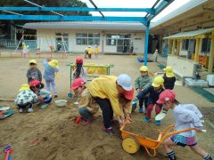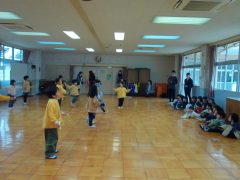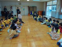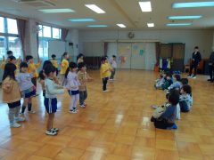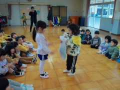 まずは「きりん組さんにダンスを見てもらいたい!」「英語の歌も聞いてもらおう!」と交流会のオープニングで、園長先生から教えてもらった英語の歌とダンスを披露したり、“やってみよう”の音楽に合わせて縄跳びやダンス、フラフープ等に取り組む姿をきりん組さんに見てもらいました。終わった後には自然に拍手が起こり、みんな嬉しそうでした。その後はみんなで時間たっぷり園庭で好きな遊びを楽しみました。一緒に遊具で遊んだり、大縄跳びをしたり、砂場遊びをしたり…「もう片付け?」「もっと遊びたい!」と時間を忘れるくらい夢中になって一緒に遊んでいました。
