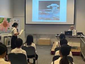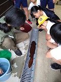 観察したオオサンショウウオを川へ戻したあとは、教室に戻って、オオサンショウウオについて詳しく教えていただきました。