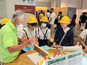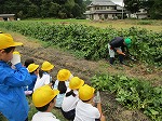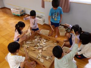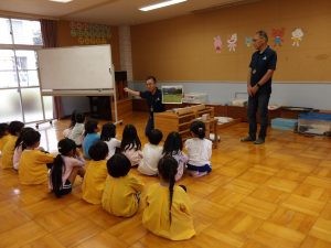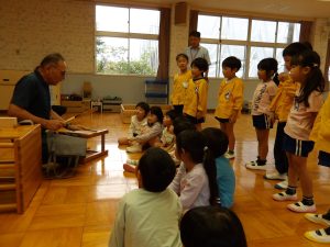 16日(木)は丹波年輪の里より2名のスタッフの方にお世話になり、木の玩具を持ってきていただき、木育指導をしていただきました。まずは丹波年輪の里はどんなところなのか、何があるのか等を写真を使って分かりやすく教えてもらいました。「行ったことあるよ!」「見たことある!」と伝えている姿もありました。そして、木の話では『のこぎり』『金づち』を使って、木がどのように切れるのかを教えてもらったり、『カンナ』という道具で木の表面を薄く削るところを見せてもらったりしました。また、実際に削った木の表面を触ったり、木の匂いを嗅いだりもしました。「これはいい匂いやな!」「この匂い嗅いだことある…」等、それぞれに感じたことを話していました。そして、木の話を聞いた後には木製玩具の遊び方の説明を聞き、早速みんなで持ってきていただいた玩具でたくさん遊びました。