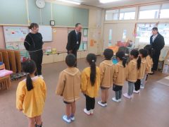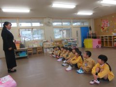 修了式では、この1年間のさくら組での取り組みを振り返り、頑張ったことやどんなすみれ組さんになってほしいか…等、園長先生からたくさんお話をしていただきました。園長先生の話を真剣に聞きながら、すみれ組への期待感があふれていました。