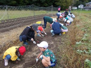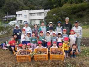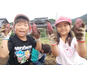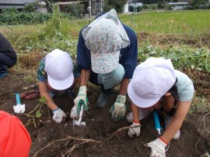 29日(月)に、民生委員児童委員さんと一緒にサツマイモ堀りをしました。5月にサツマイモの苗植えをし、そこから収穫できる日を心待ちにしていたみんな。苗植えをしてから民生委員児童委員の方にお世話になり、日々草刈りをしていただいたり、サツマイモの生長を近くで見守ってくださったおかげで、みんなで苗植えをしたサツマイモがぐんと大きくなっていました。そしてかやのみ幼稚園のみんなは大きく成長したサツマイモ畑を見て大喜びでした。「サツマイモを傷つけないように掘ろうね」「ここにたくさんある!」「このサツマイモは五人兄弟やった!」と、友達とそれぞれに感じたことを伝え合ったり、「ここ一緒に手伝ってほしい」「自分で採れたよ!」と民生委員児童委員さんと積極的に会話をしたりする姿もありました。民生委員児童委員さんに優しく、丁寧に掘り方を教えていただきながら、サツマイモ堀りを存分に楽しみました!そしてたくさん収穫したサツマイモを大切に幼稚園に持ち帰りました。11月には民生委員児童委員さんと一緒に焼き芋大会ができることを楽しみにしている子どもたちです☆