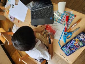 図工の時間に、紙コップ・ストロー・ふくろを使っておもちゃを作りました。