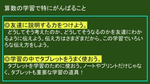 特にこの学習では、①友達への説明の仕方 ②タブレットの使い方 を意識しながら学習に取り組んでいます。
