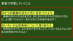 算数の時間では、直線の交わり方である「垂直・平行」といろいろな四角形について学習しています。